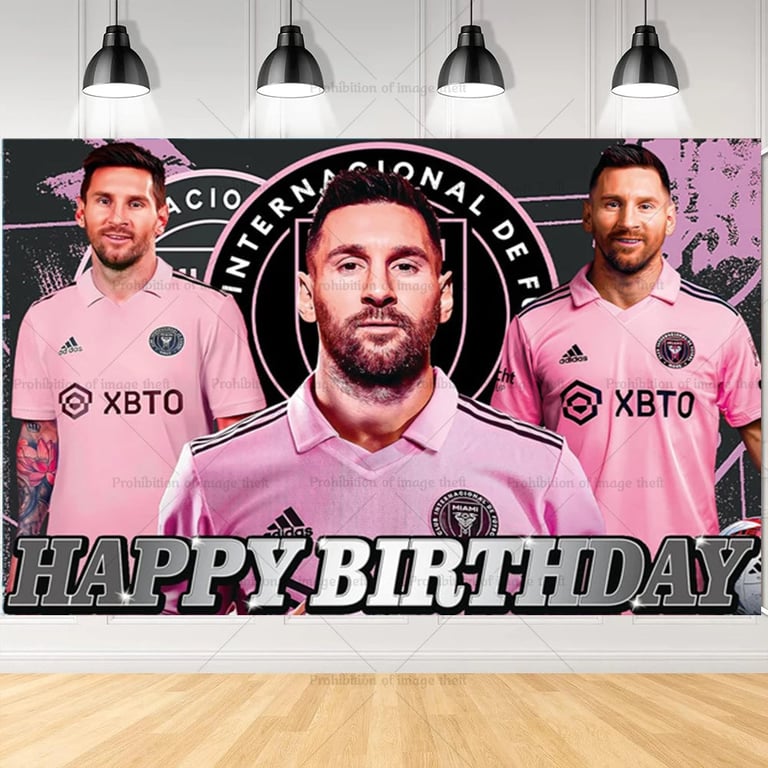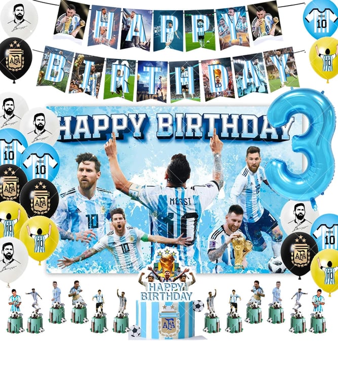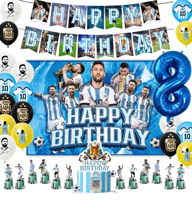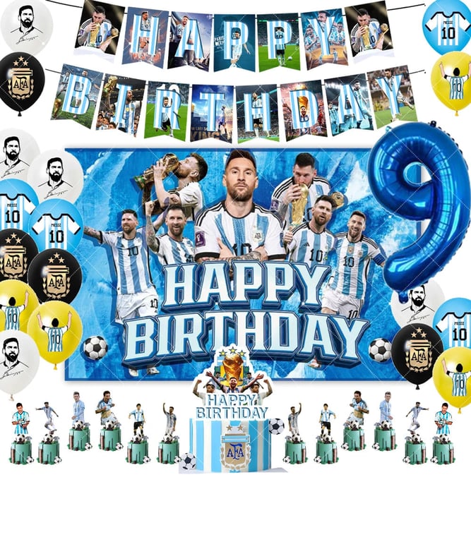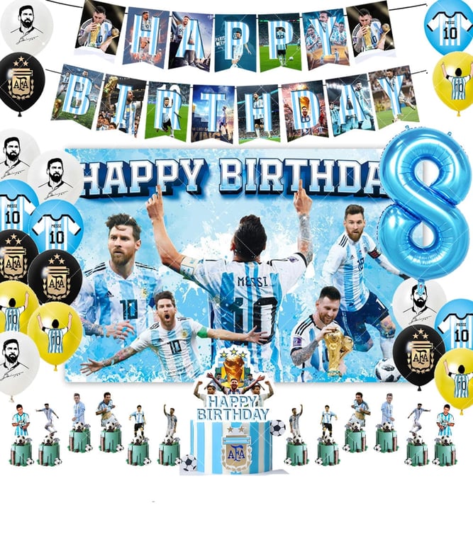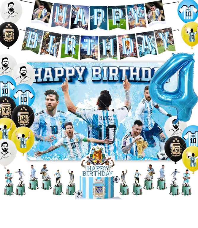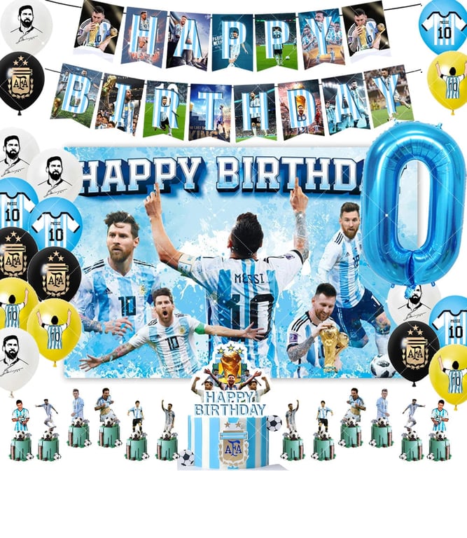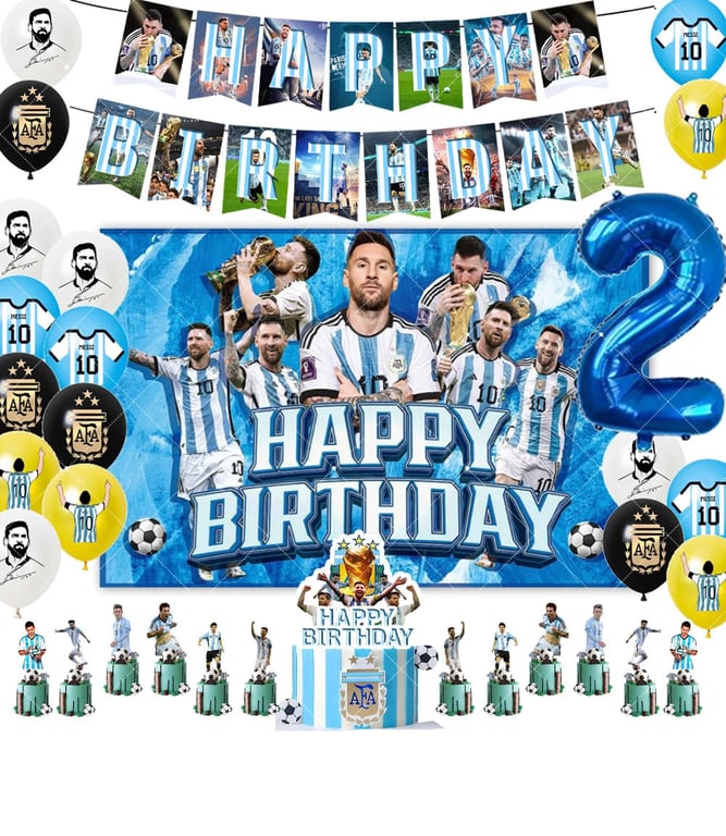 Birthday football party set with Lionel Messi balloons. Contents of the package: see image. The banner measures 120 x 90 cm.