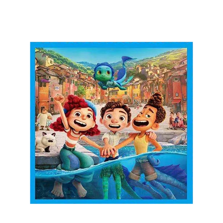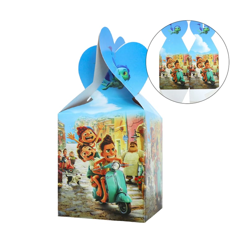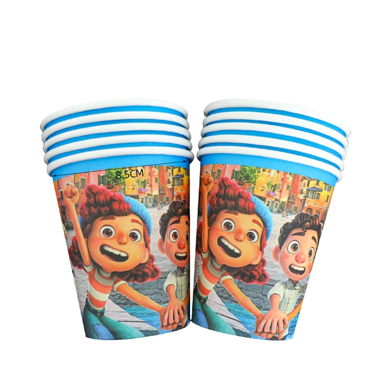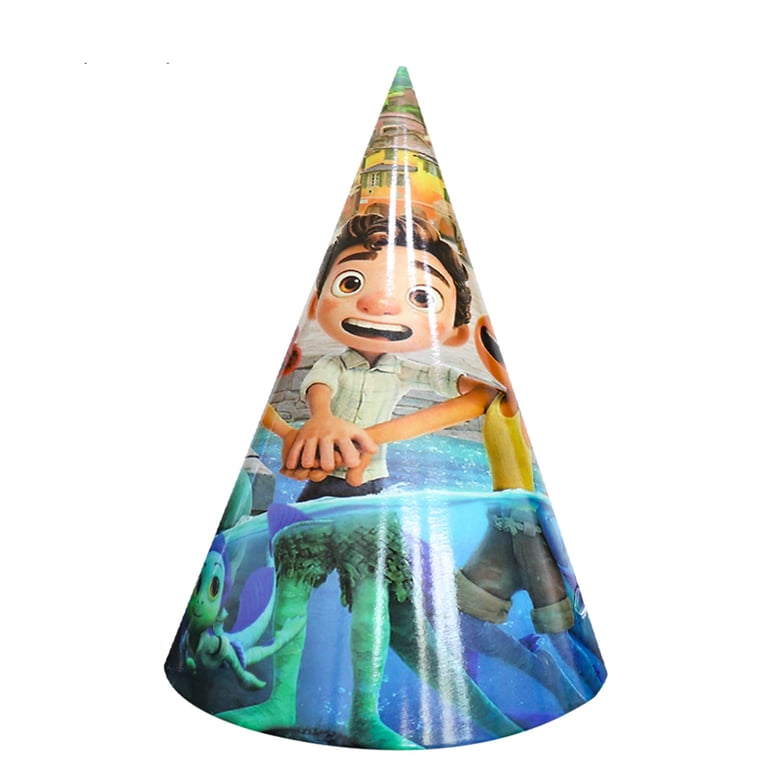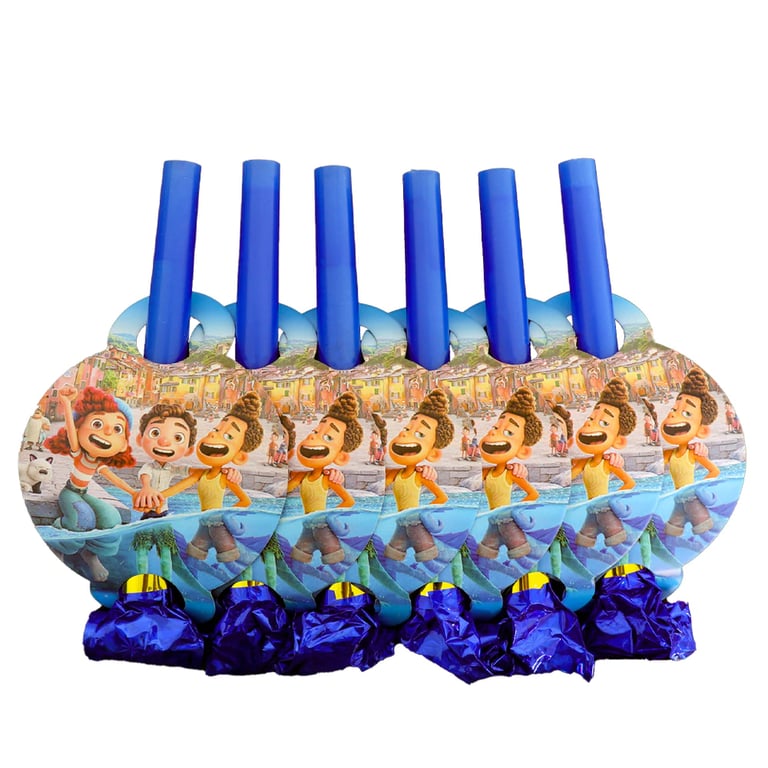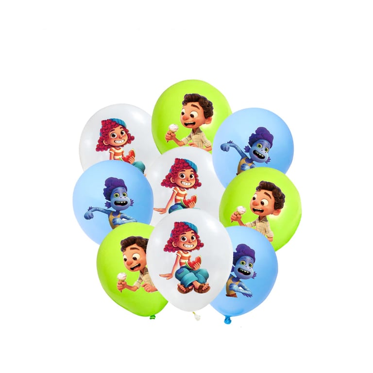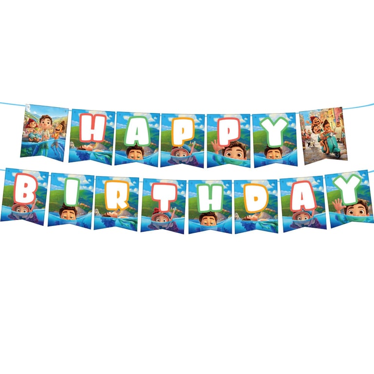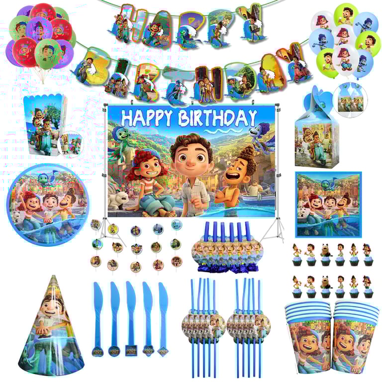 Birthday party decorations featuring the film Luca