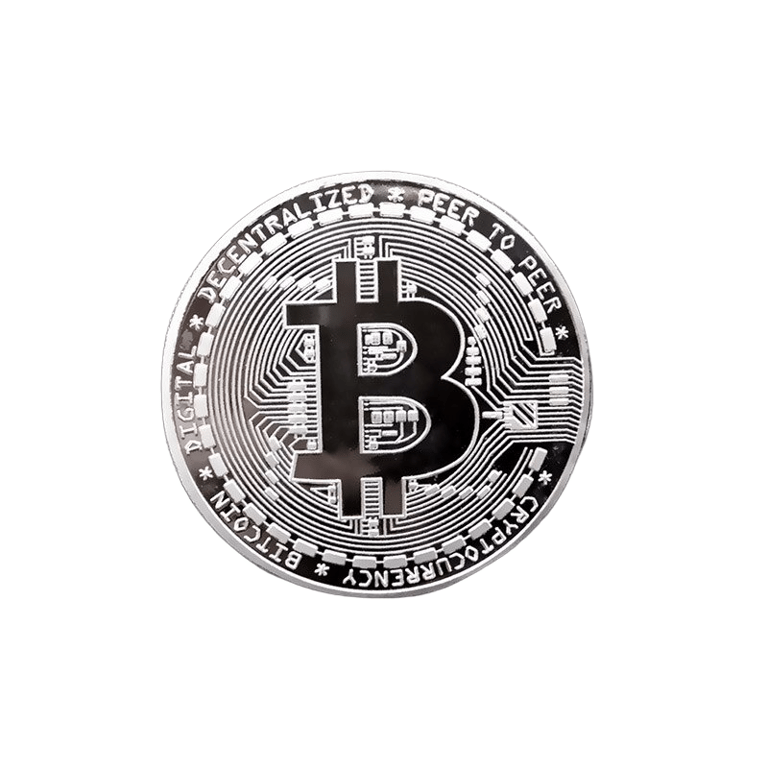 A collectible Bitcoin coin that is double-sided. The front features the symbol B. The back has an integrated circuit. It is made of iron.