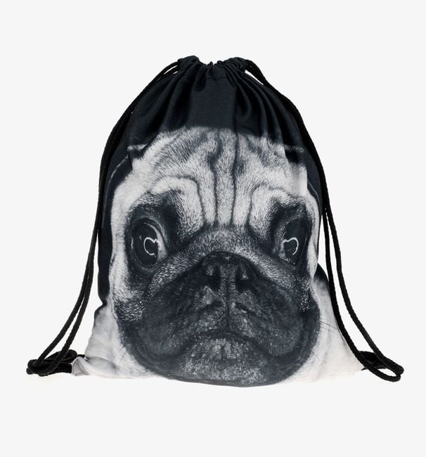 Does the cuteness of pugs bring you to your knees? Then don't hesitate and get this original backpack, featuring a pug on it. The bag is a very original and practical accessory that will surely find its use with you. The bag is tightened with drawstrings, which also serve as shoulder straps.