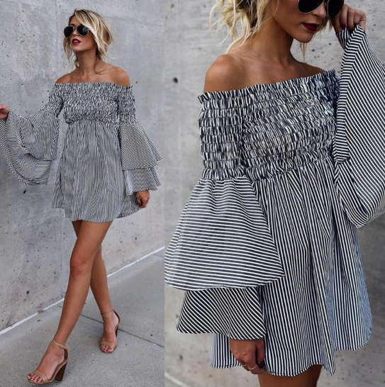 Black and white striped loose airy women's summer dress with large sleeves.