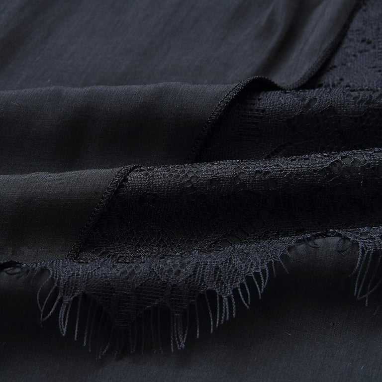 Luxurious black dress below the knee with an asymmetrical skirt adorned with lace.