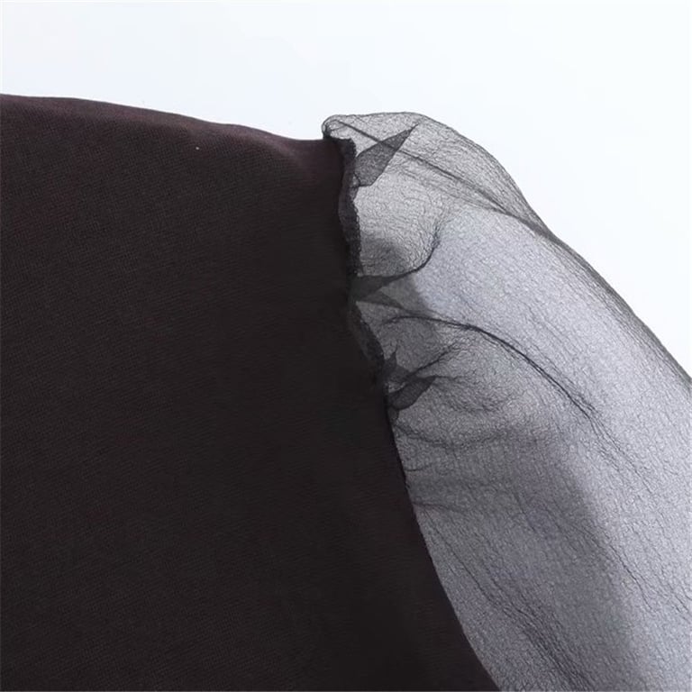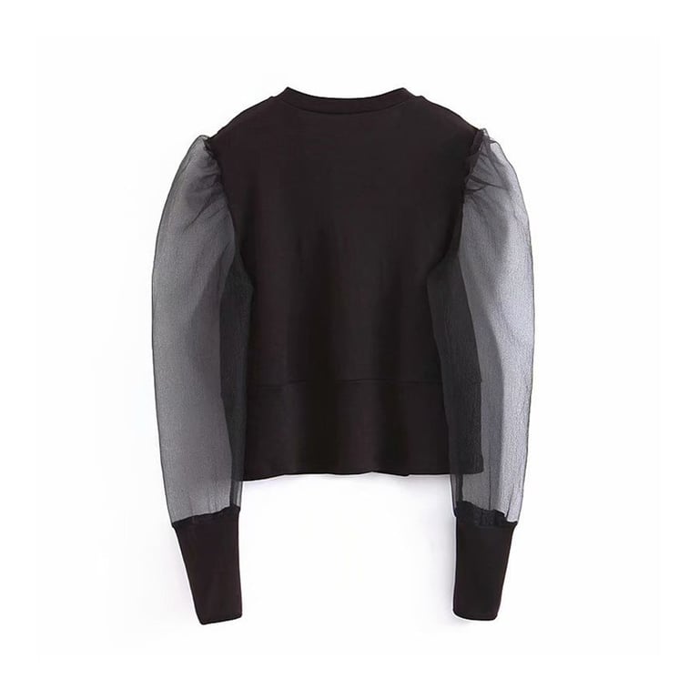 Adorned with long, fluffy sleeves made from sheer fabric.