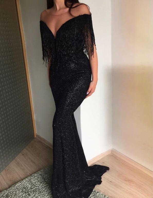 Black fitted shaping evening dress with fringes