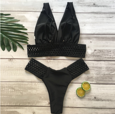 Black mesh two-piece swimsuit with lace