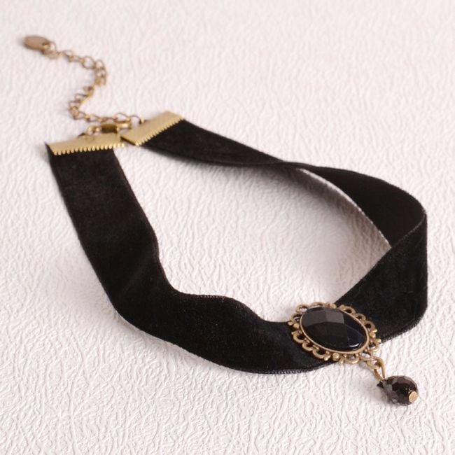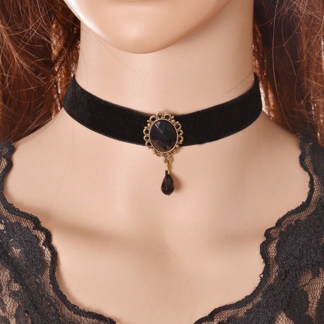 The modern gothic-style necklace is suitable for young ladies who prefer this fashion. The necklace is in classic black and is adorned with a large gemstone. The fastening is adjustable to any size. The necklace will be a stylish accessory for young ladies who enjoy extravagance.