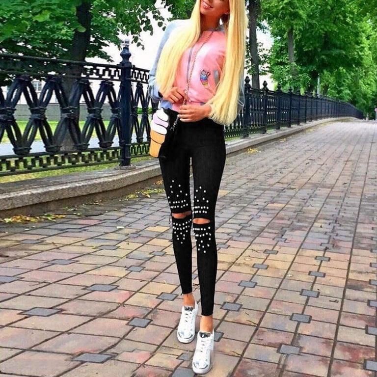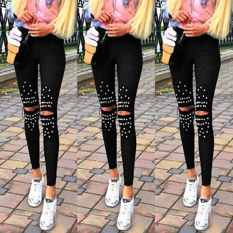 Black women's jeans with studs and knee rips