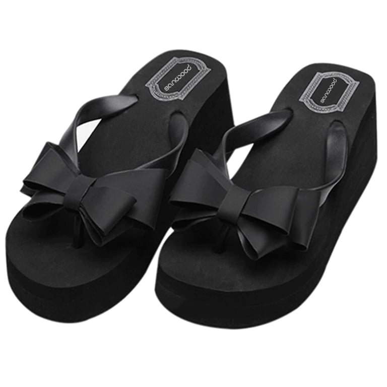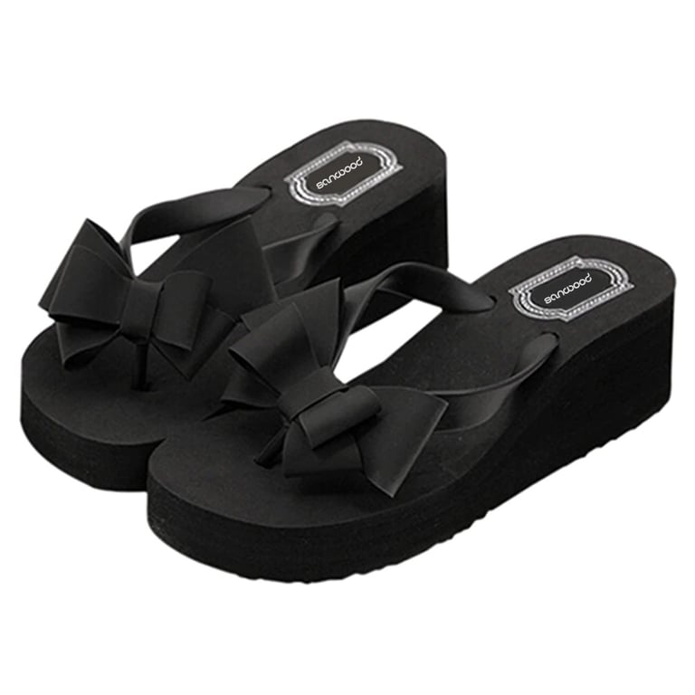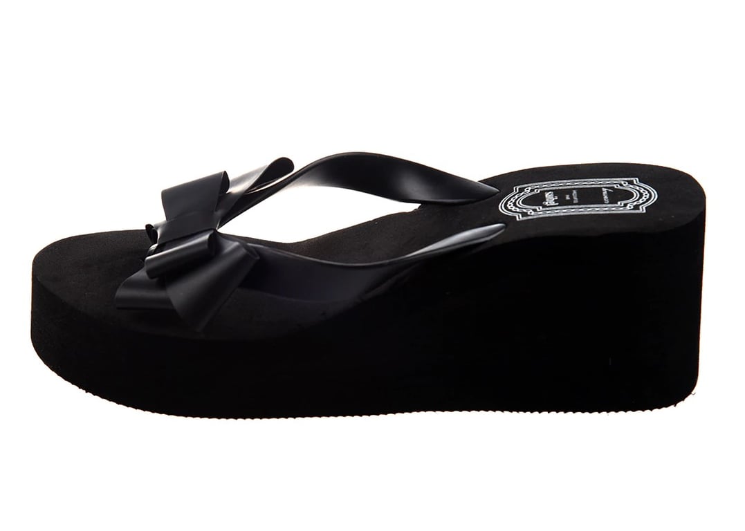 You will love these platform flip-flops adorned with a bow. The flip-flops are in black.
