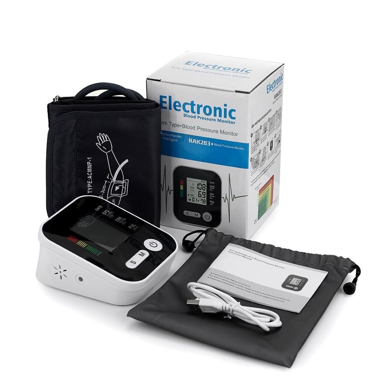 Package contents: 1x blood pressure monitor, 1x USB cable