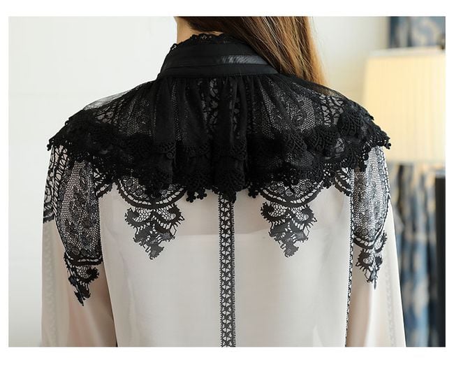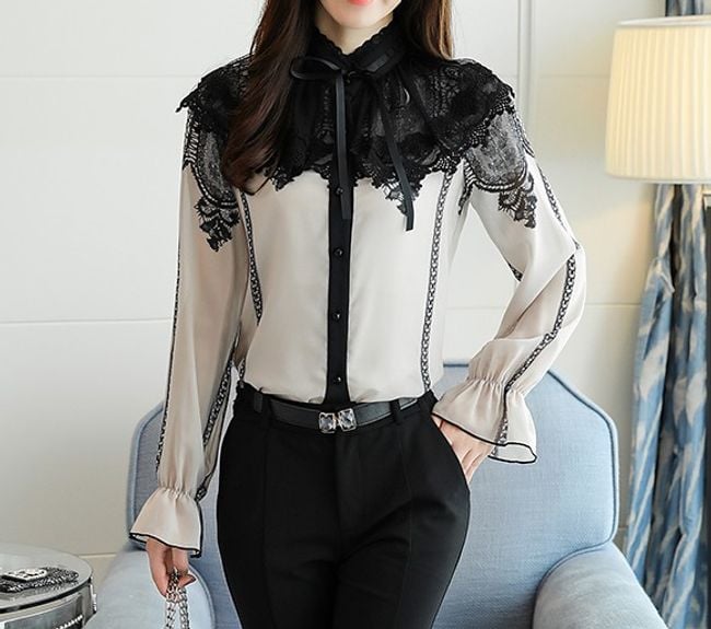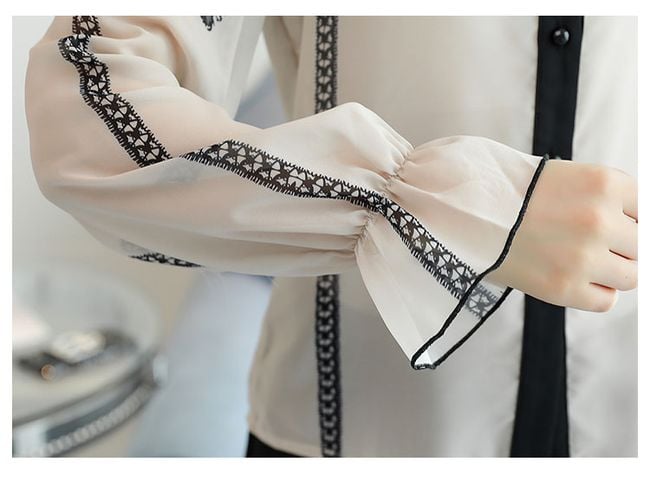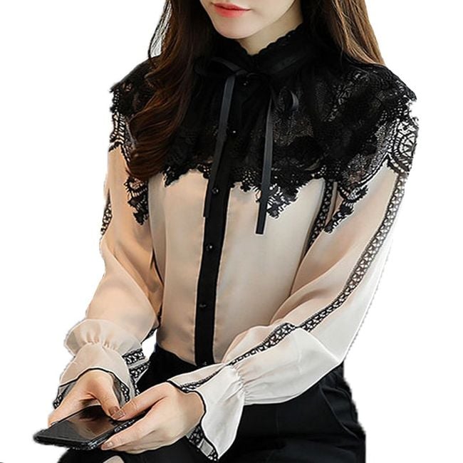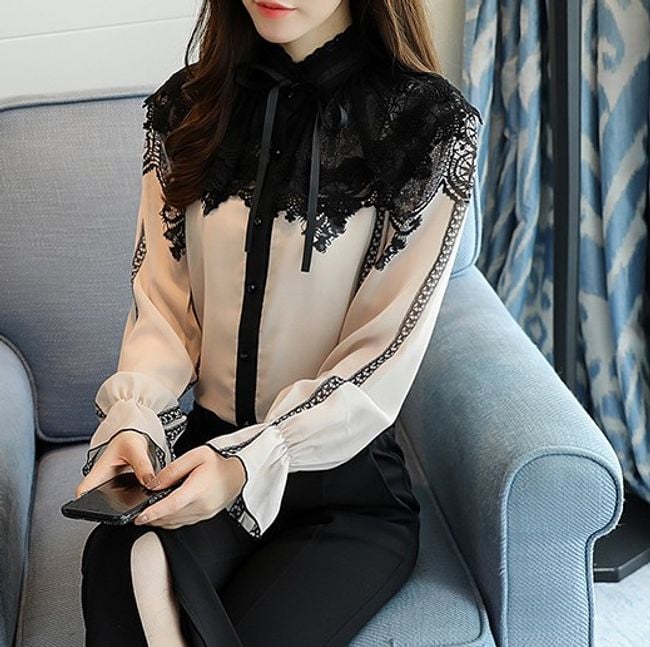 Elegant blouse fastens with buttons and features a bow at the neck.