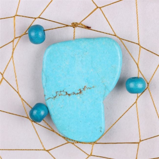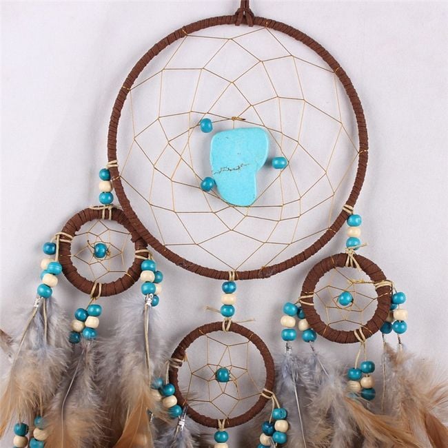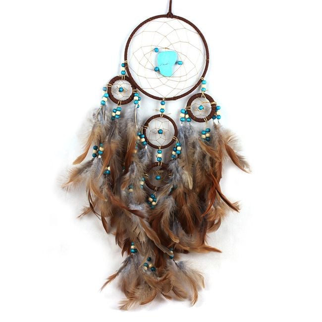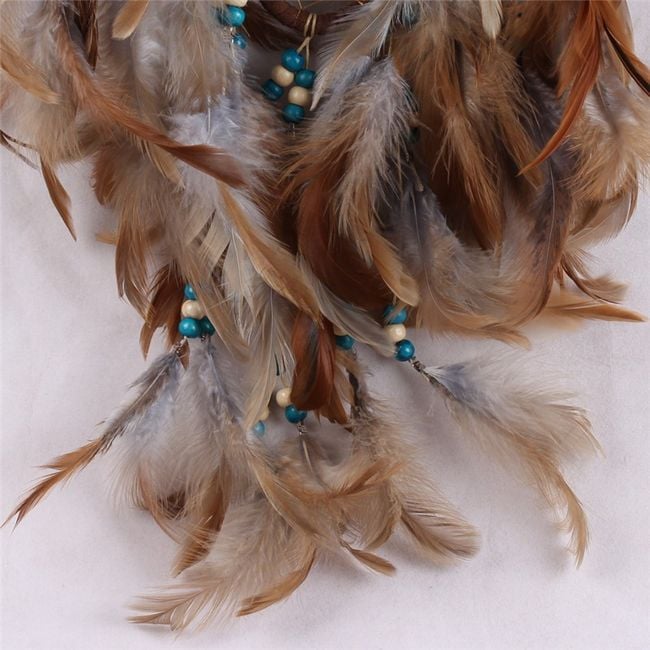 The dreamcatcher features feathers that have a rainbow colour ranging from grey to dark brown and is adorned with light blue and white beads.