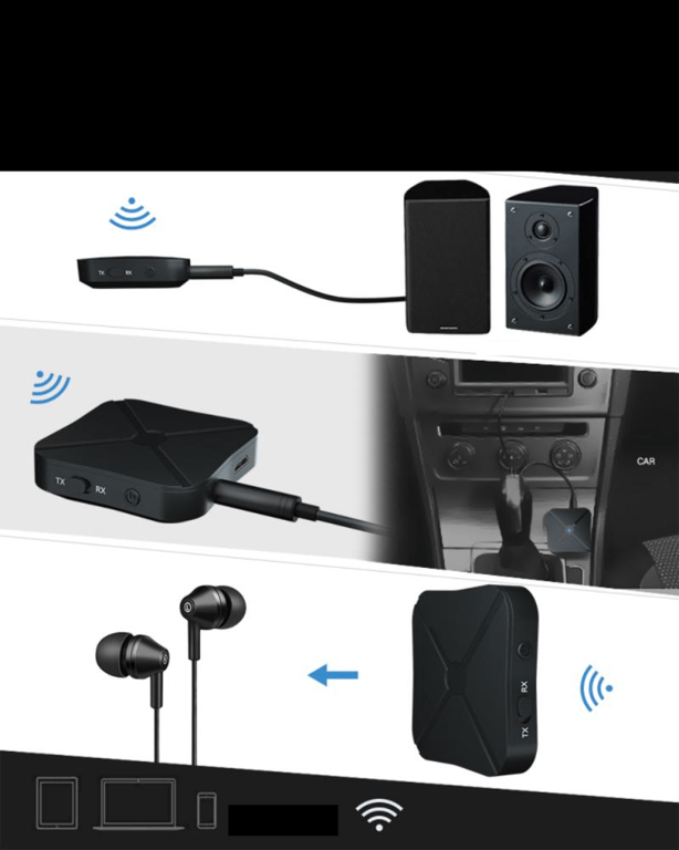 • RECEIVER MODE: wirelessly receives audio from your Bluetooth device (mobile phone, tablet, PC…) to your connected device (speakers, headphones, car radio, TV…)