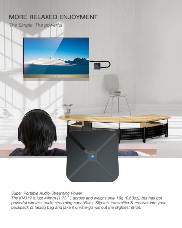 • TRANSMITTER MODE: wirelessly transmits audio from your device that does not have Bluetooth (TV, home stereo system, CD player…) to your Bluetooth device (Bluetooth headphones, Bluetooth speakers…)