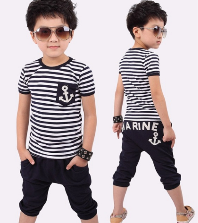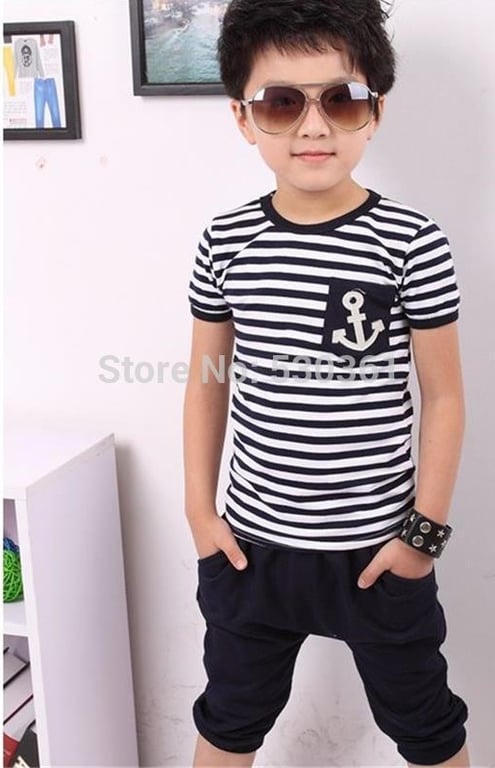 The set includes a striped t-shirt with an anchor and black sweatpants.