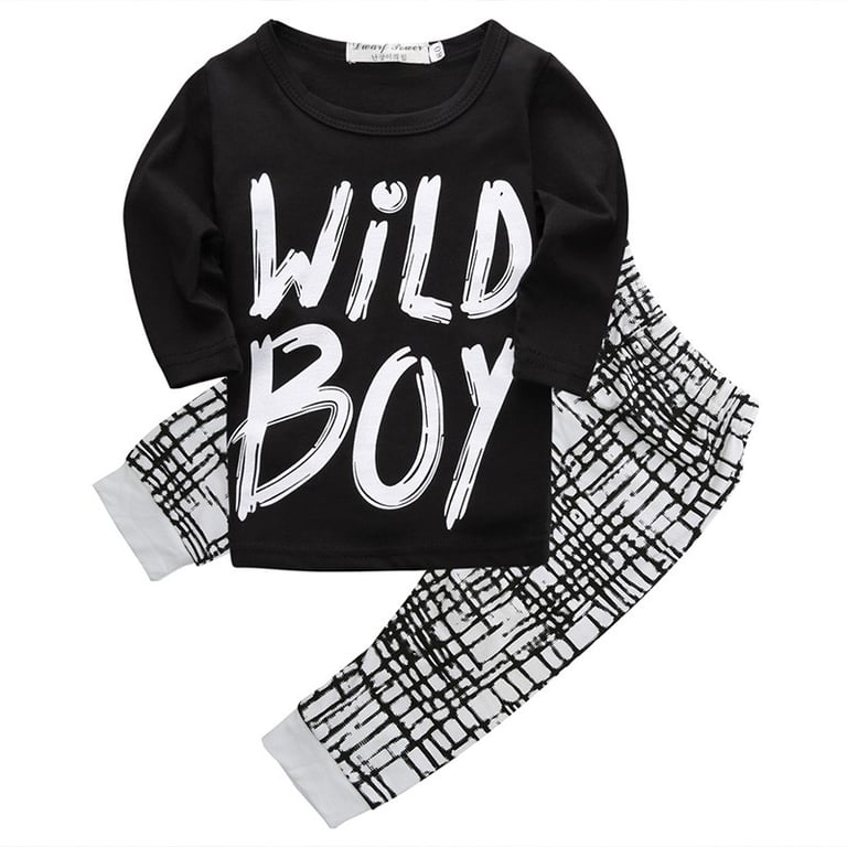 The set includes a hoodie with the inscription WILD BOY in black, and black and white joggers.