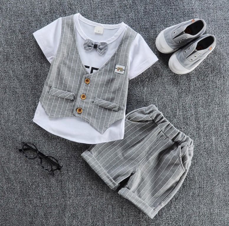 Dress your little boy elegantly with this smart suit set featuring a bow tie.