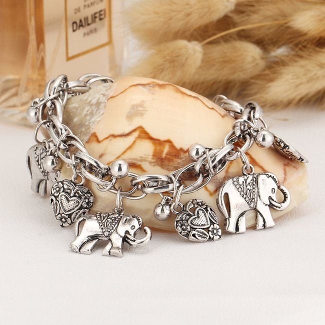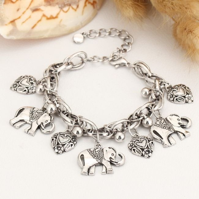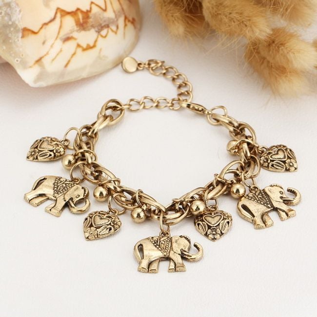 Beautiful bracelet in gold or silver colour. Elephant charms alternate with heart charms and small beads. A lovely talisman for good luck.