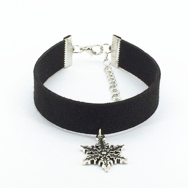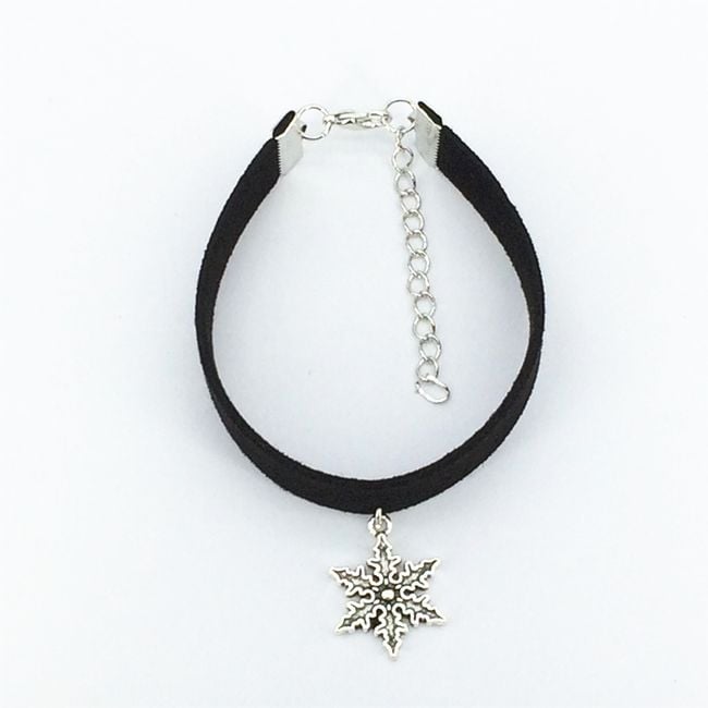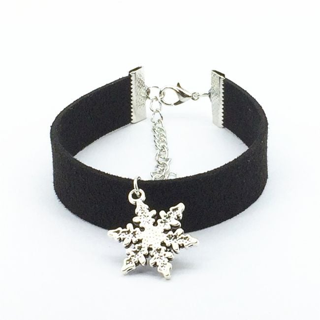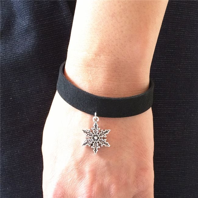 The bracelet adorned with a snowflake serves as an elegant accessory.