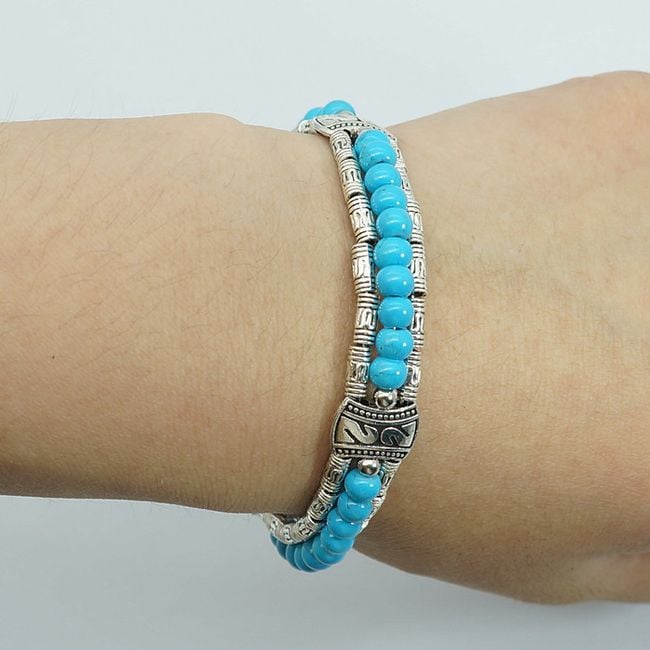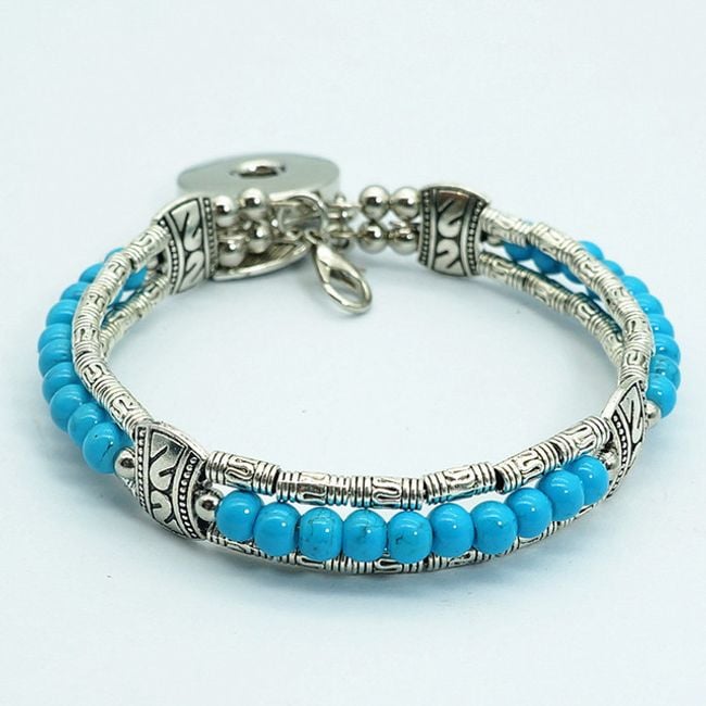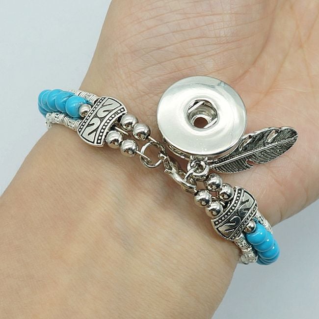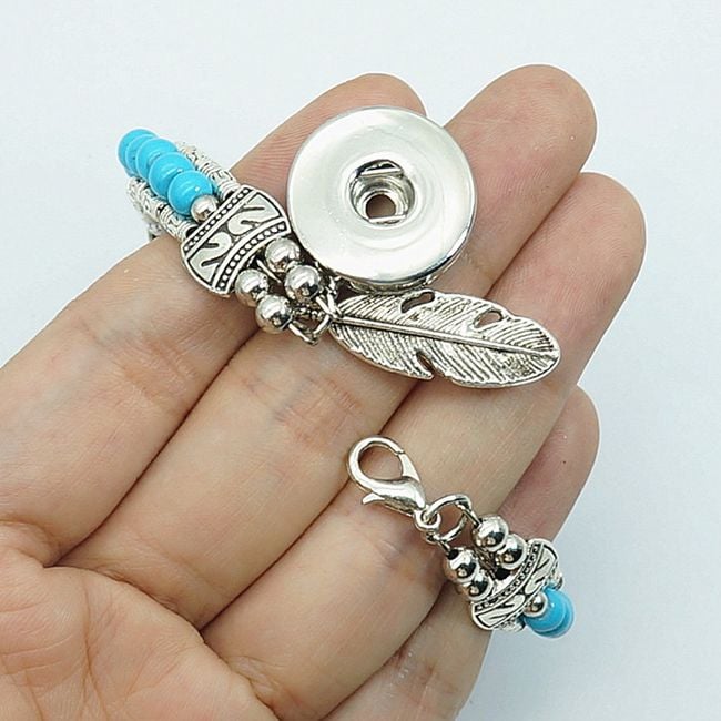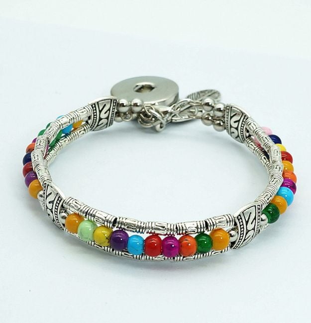 The bracelet features colourful beads and is adorned with small charms in the shape of a feather and a doughnut.