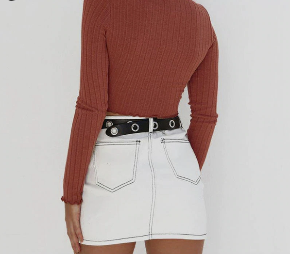 Brick-coloured shorter knitted fine women's sweater with long sleeves.