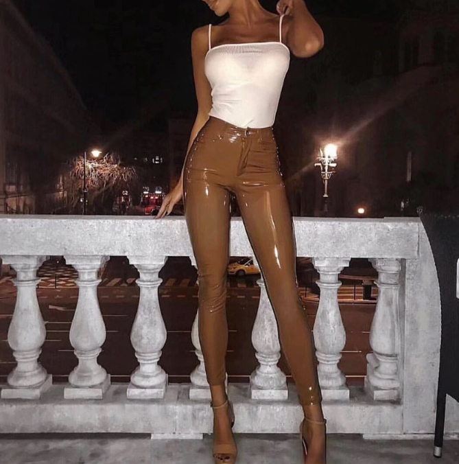 Brown glossy faux leather women's trousers