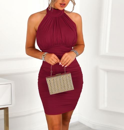 Burgundy interesting pleated beautiful women's dress with a collar.