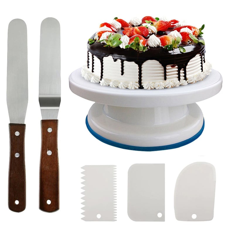 Everything you need for decorating with cream and fondant in one. The package includes two pastry knives, three decorating spatulas for cream/fondant, and lastly, a practical stand that elevates the cake beautifully, giving you the best access. All of this is made from high-quality silicone material, making the accessories easy to maintain.