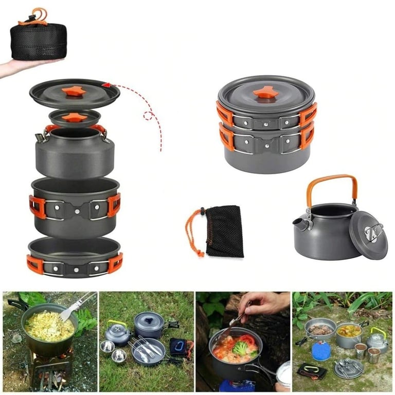 This camping utensil set is perfect for anyone who loves spending time in nature! Made from aluminium, this set is sturdy and easy to store and carry. It includes a camping kettle, frying pan, and pot, so you'll have everything you need to prepare a delicious meal under the stars.
