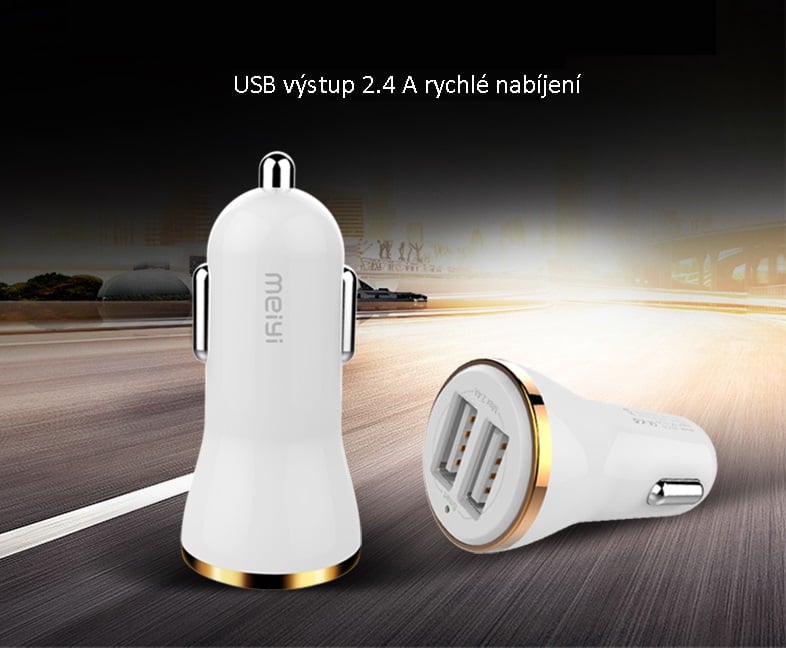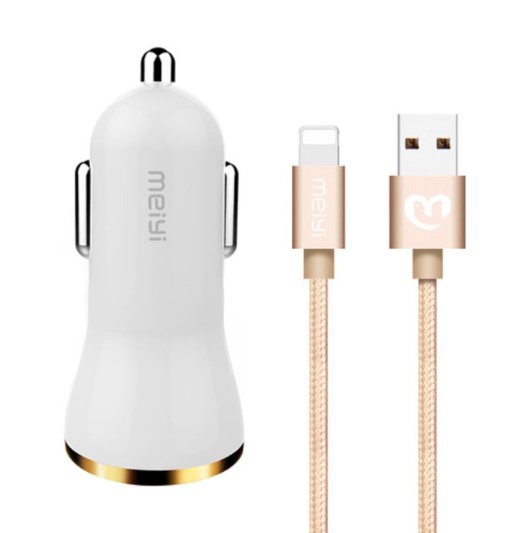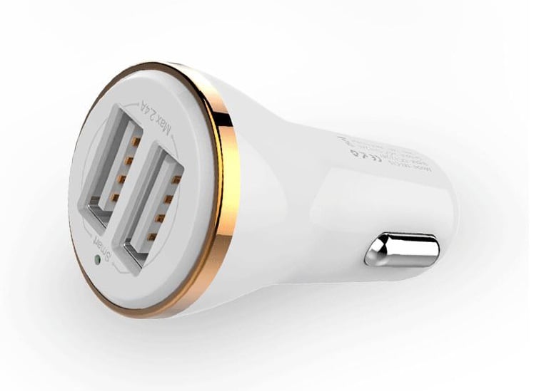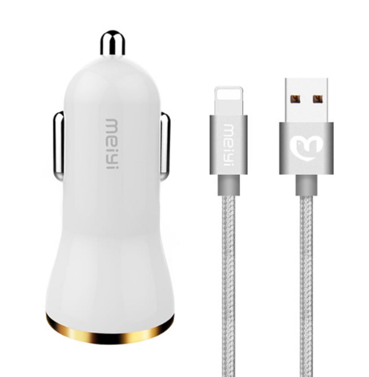 Car charger with USB cable featuring 2 ports for all phone brands.