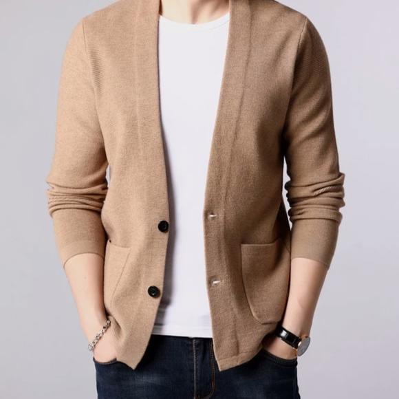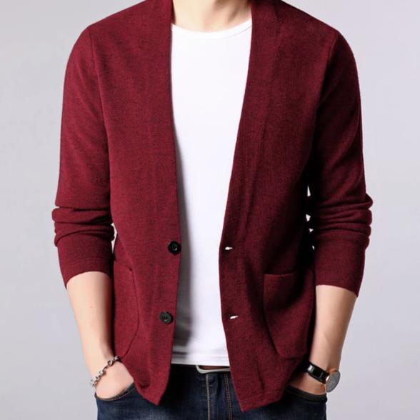 A cardigan with buttons and a large V-neck. Two large practical pockets on the sides.