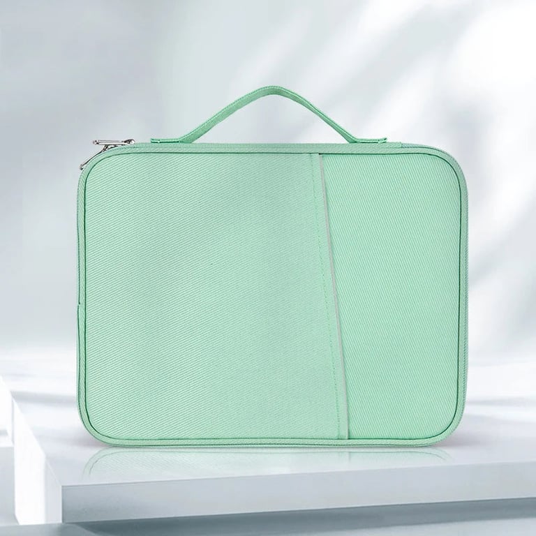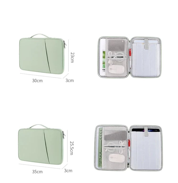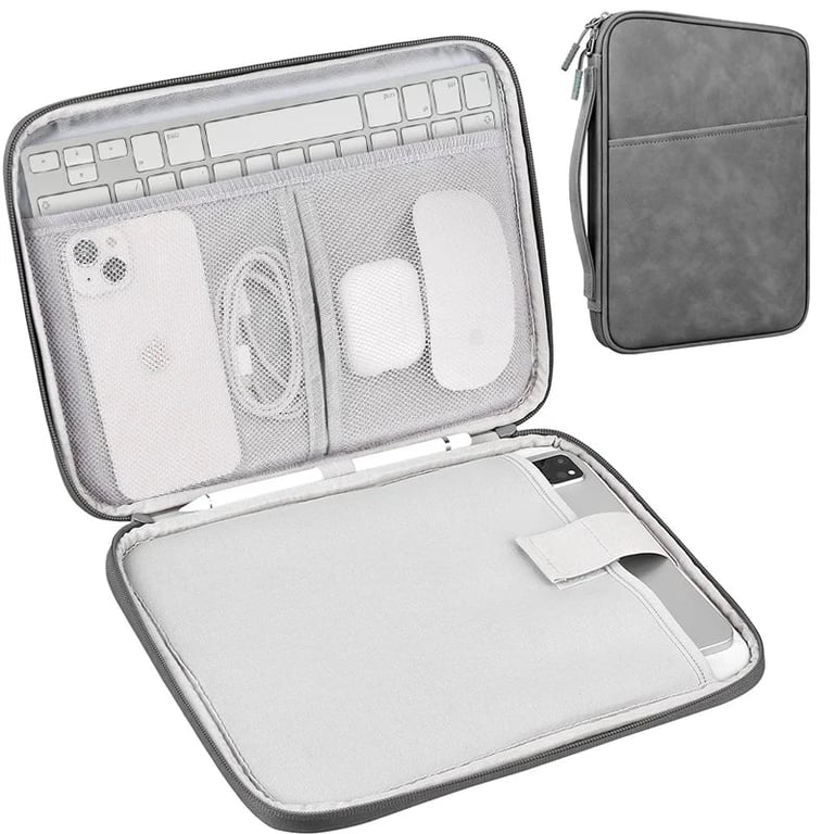 The bag is designed for tablets measuring 9–11 inches (e.g., iPad Pro 11, iPad Air 10.9, iPad 10th, M2, etc.). It offers sturdy reinforcement, an internal organiser for a keyboard, phone, cables and other small accessories, a robust zip, the outer material is washable and durable. Available in several colours (black, grey, pink, white, green, blue).