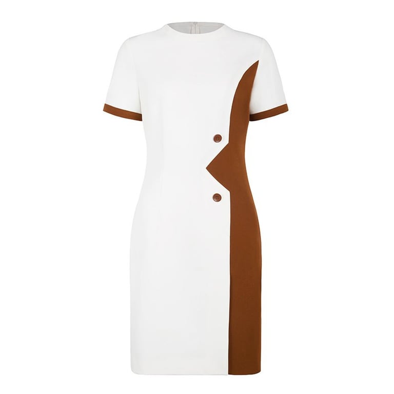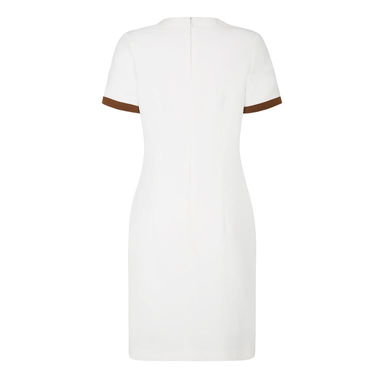 Women's elegant dress with short sleeves and a round neckline. Short straight cut with a length above the knee and a subtle slit.