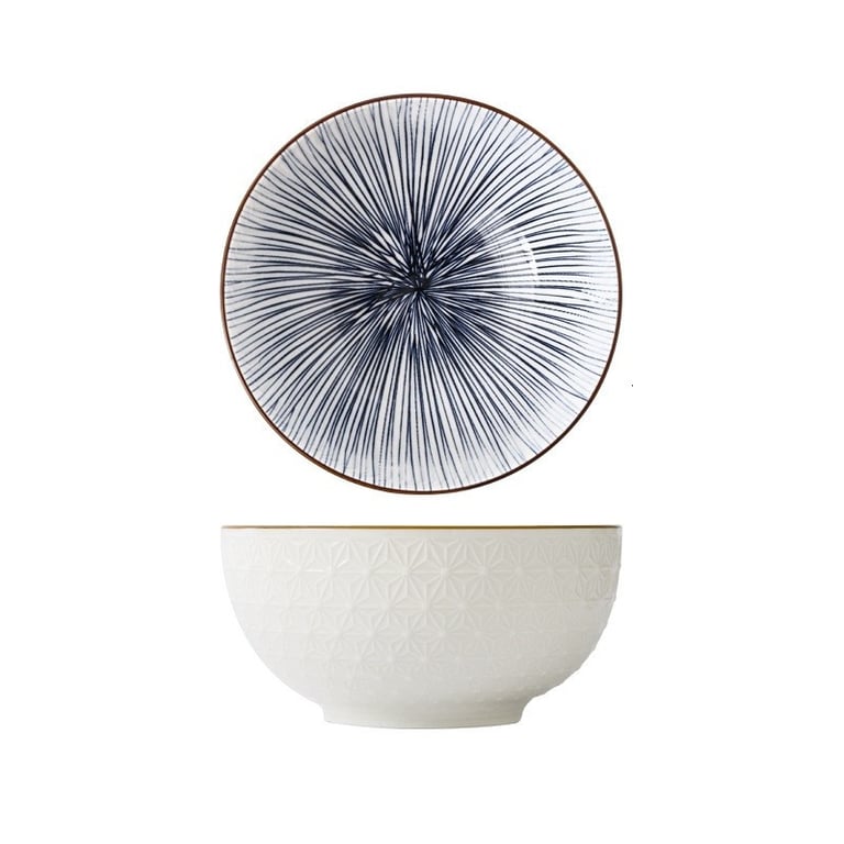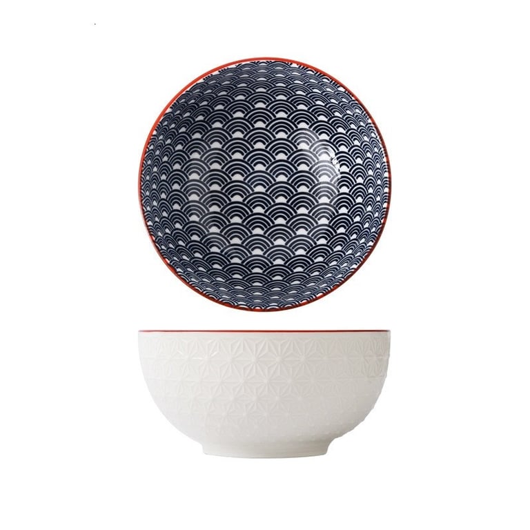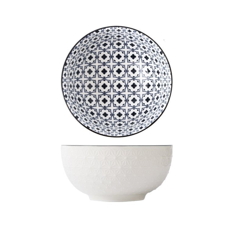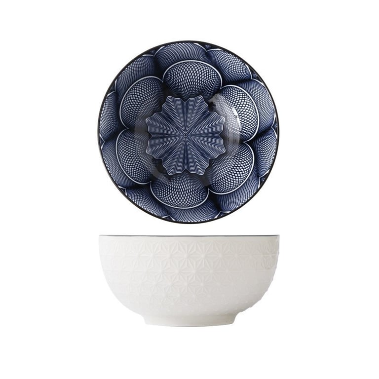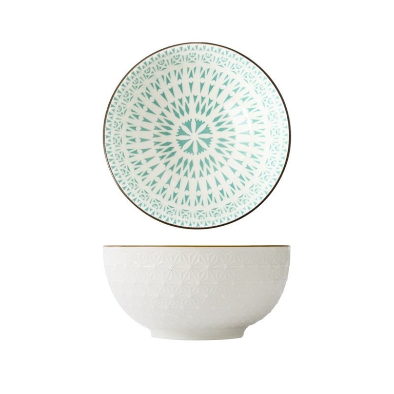 A bowl suitable for salads or soups with decorative painting and engraved ornaments.