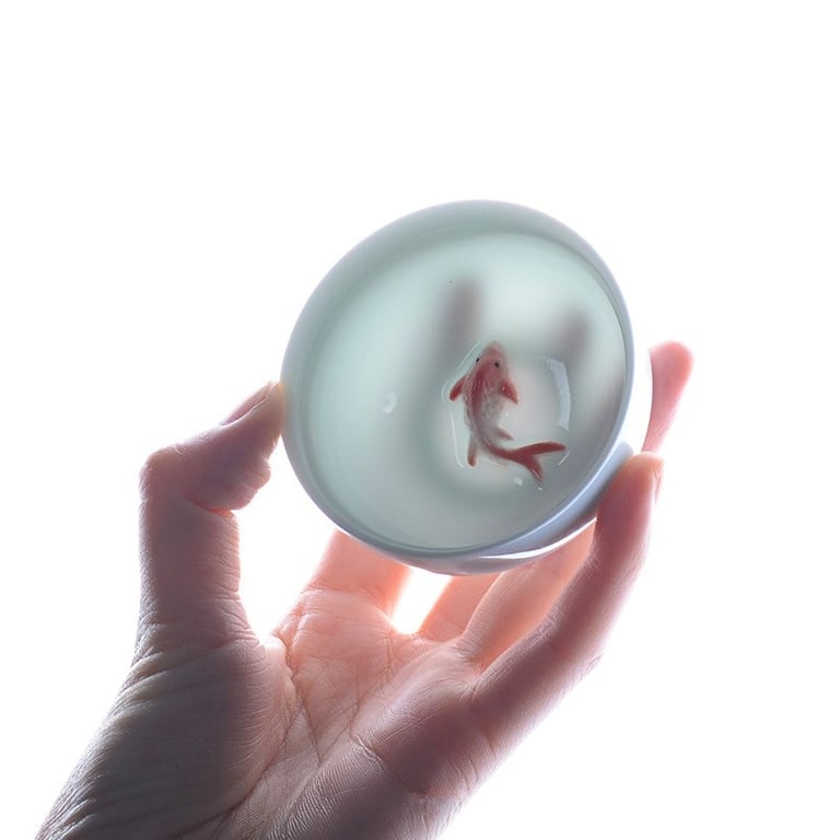 A cup in traditional Chinese design featuring a Koi carp emerging from the bottom.
