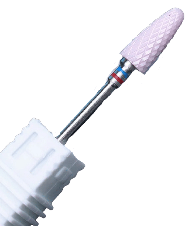 A drill bit with two types of grit, which is for shortening artificial nails and filing the underside of the nail. It is also recommended for removing calloused skin from the heels. The colour of the stripe indicates the type of grit.