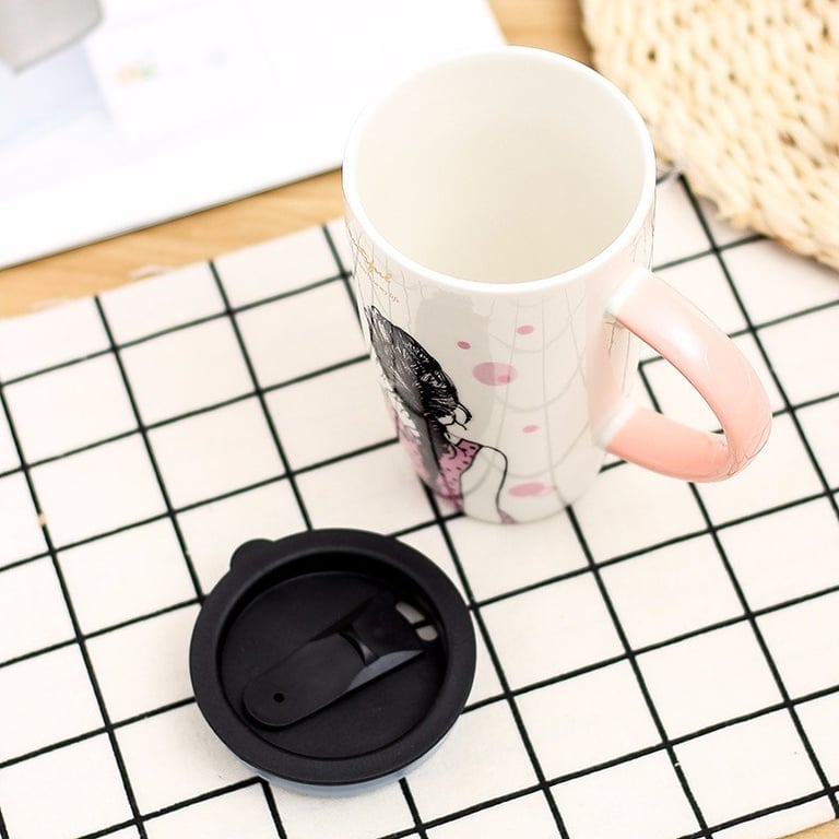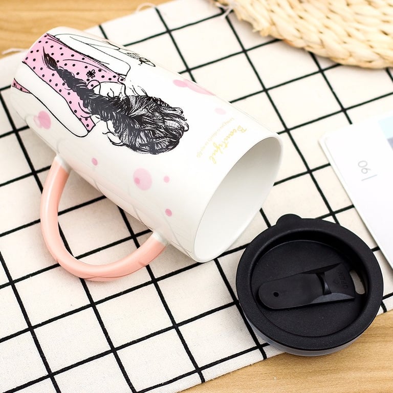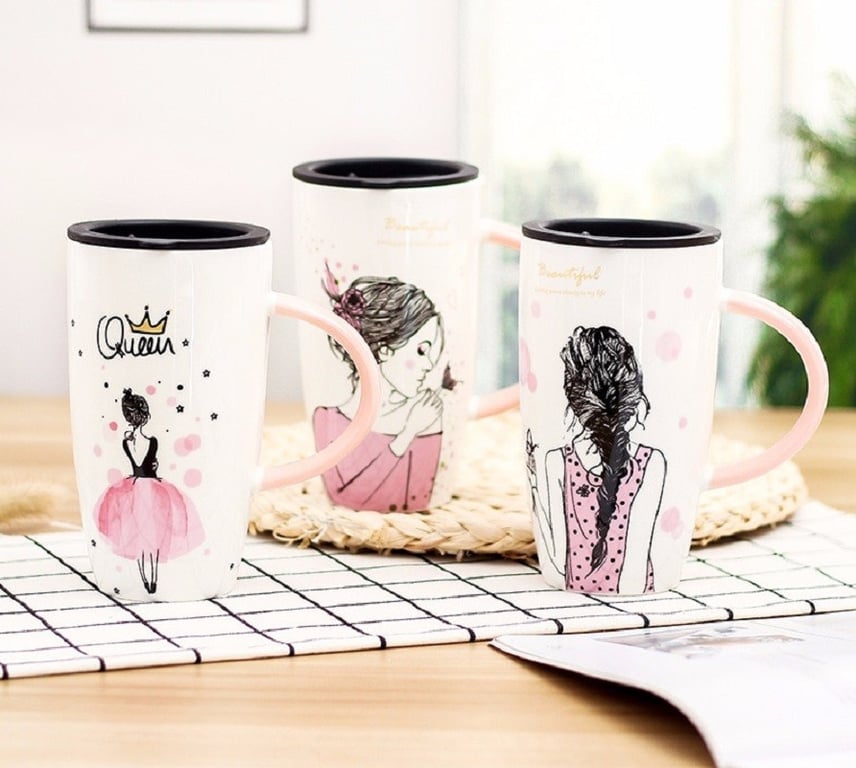 Mug featuring a painting of a girl and a practical lid.