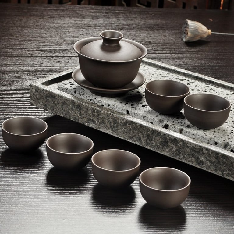 Includes six cups and, depending on your choice, either a teapot or a traditional gaiwan tea bowl.
