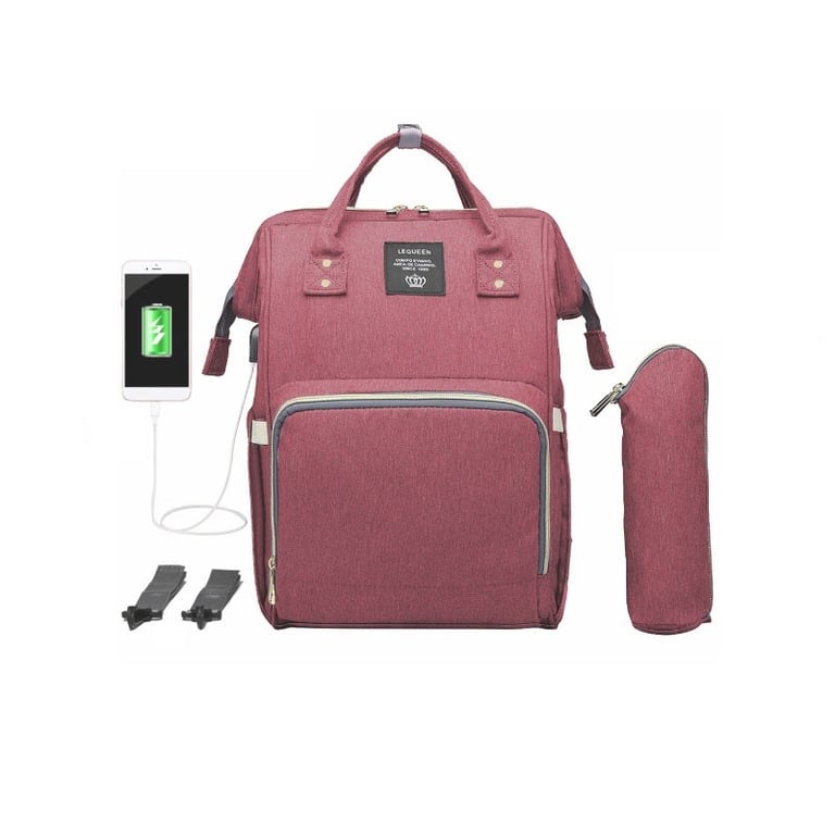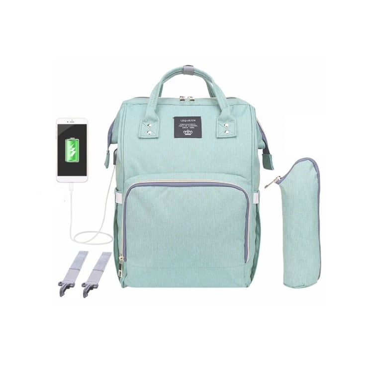 A practical multifunctional backpack for mothers with a USB port for charging.