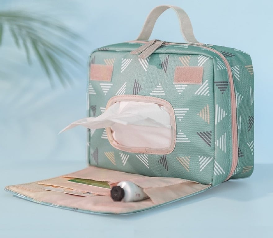 A practical multifunctional case for changing essentials with a tissue dispenser.