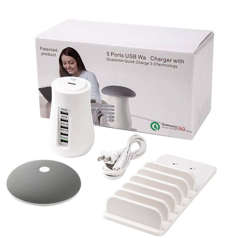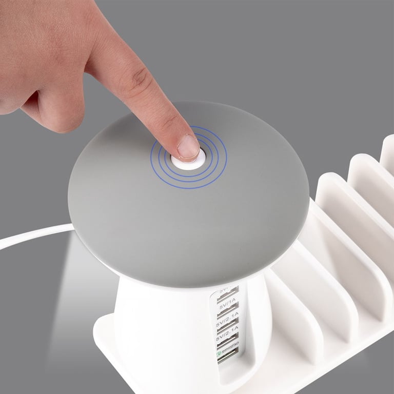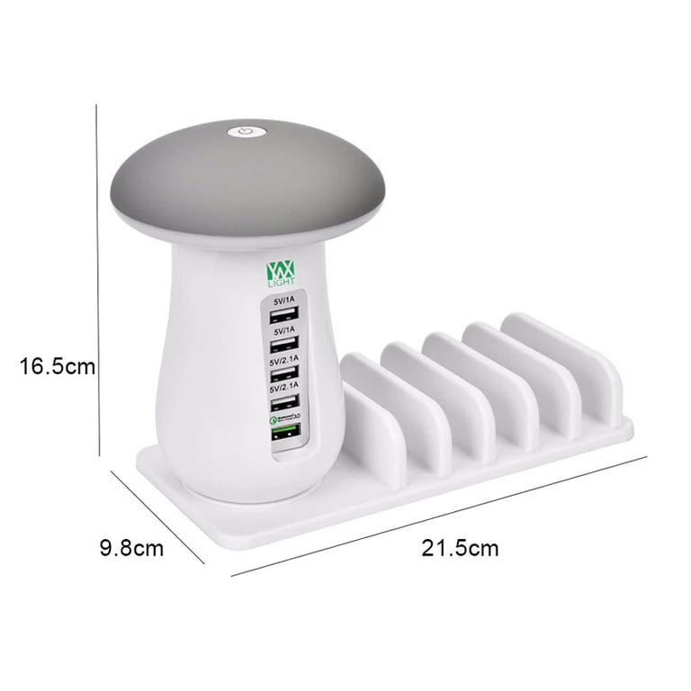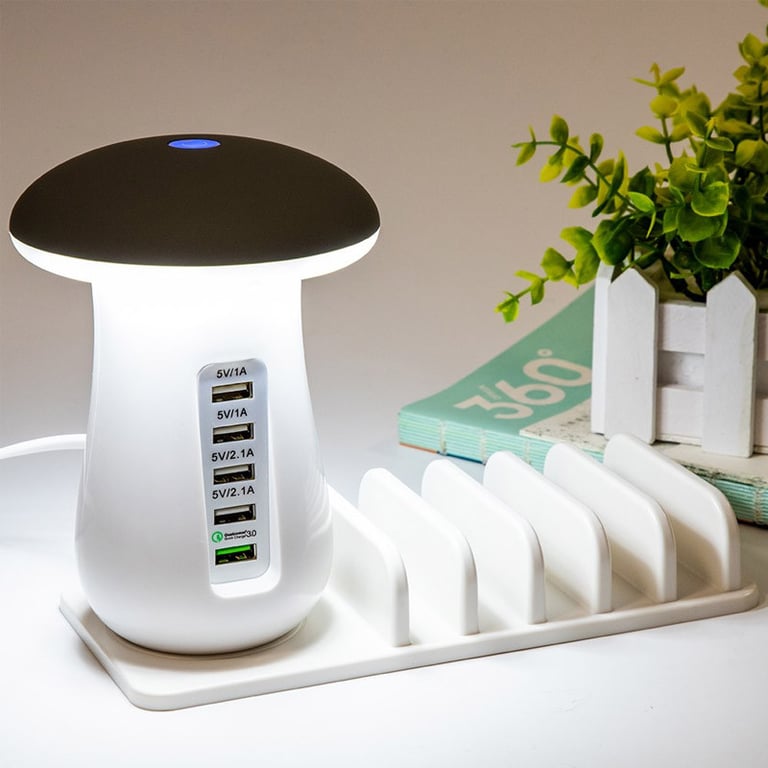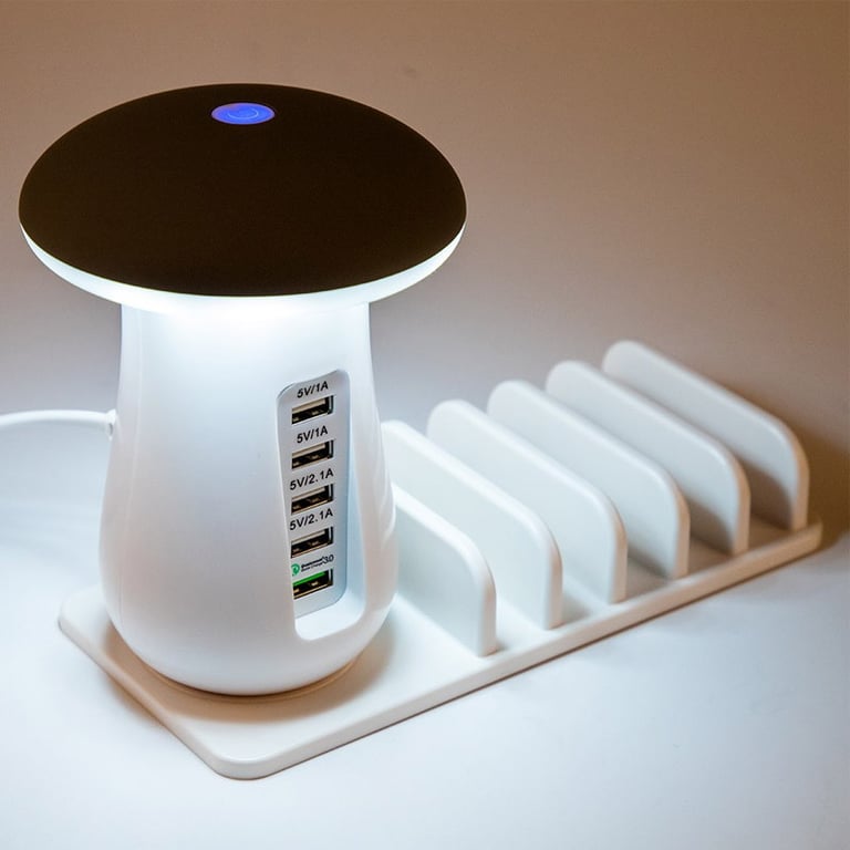 Table charging station with 5 USB ports and a mushroom design lamp that emits soft, eye-friendly light. Ideal for travel or as a home decoration. Allows charging up to 5 devices simultaneously at high speed.