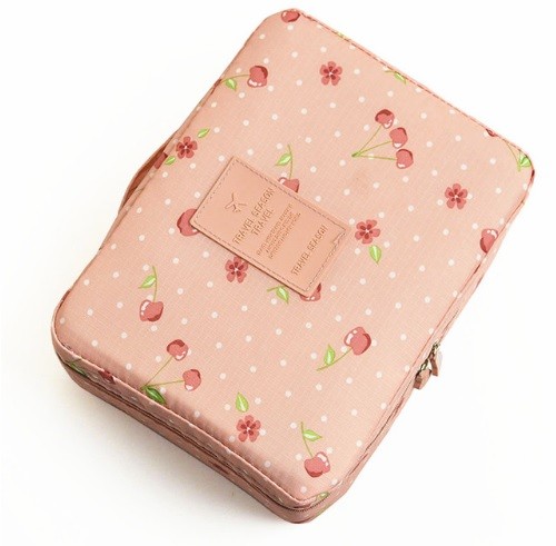 Women's cosmetic pouch with a small polka dot or cherry design for an organised arrangement of essential cosmetics for travel.
