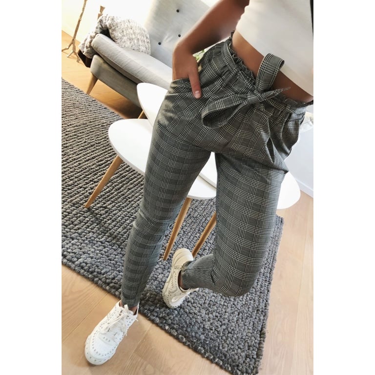 Checked grey 3/4 women's trousers with a bow at the waist.
