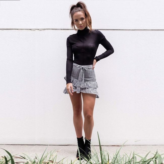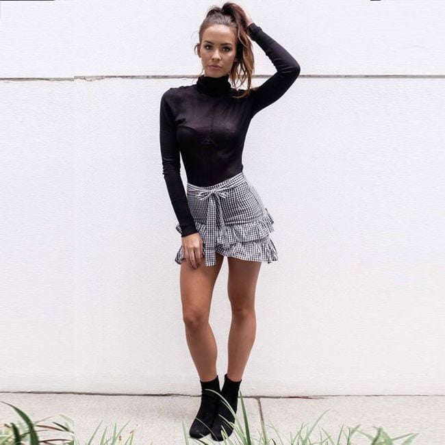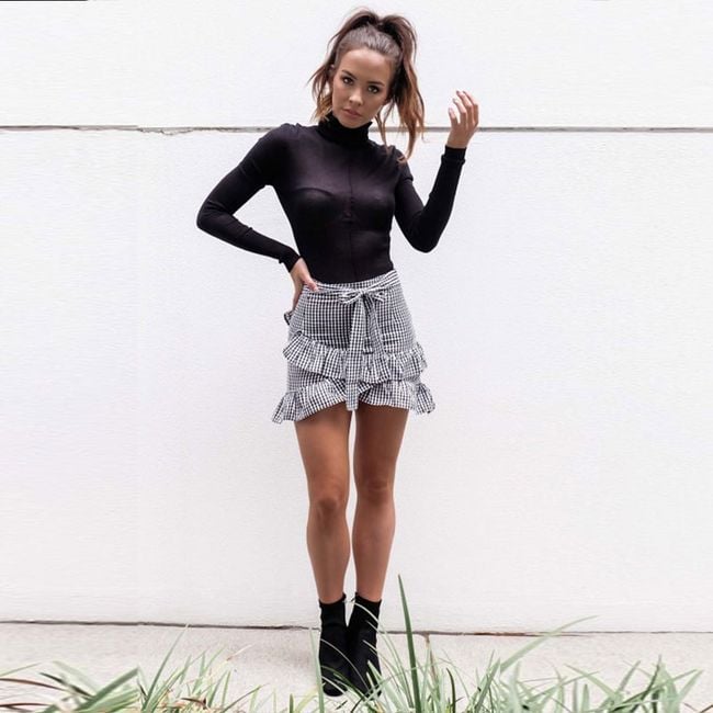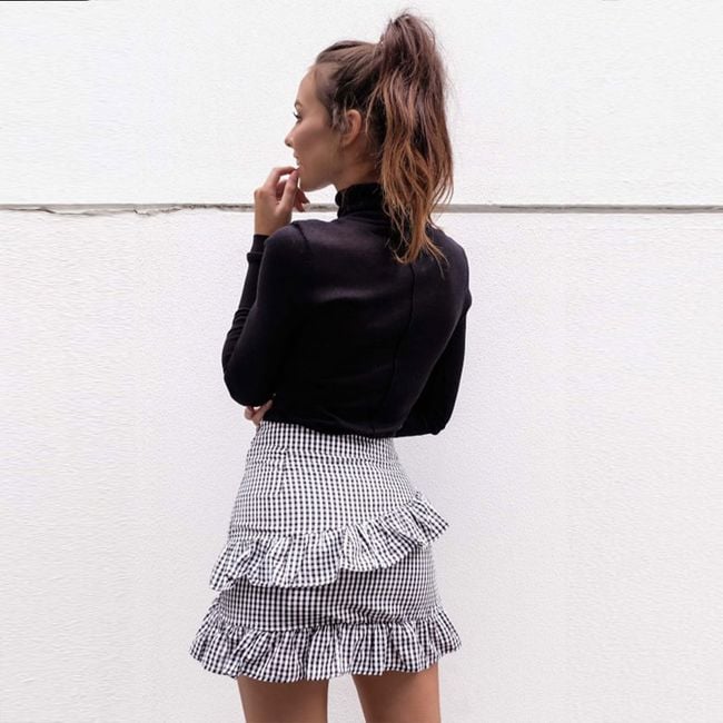 The skirt features a very elegant check pattern, delicate ruffles, and is suitable for everyday wear, work, or the theatre.