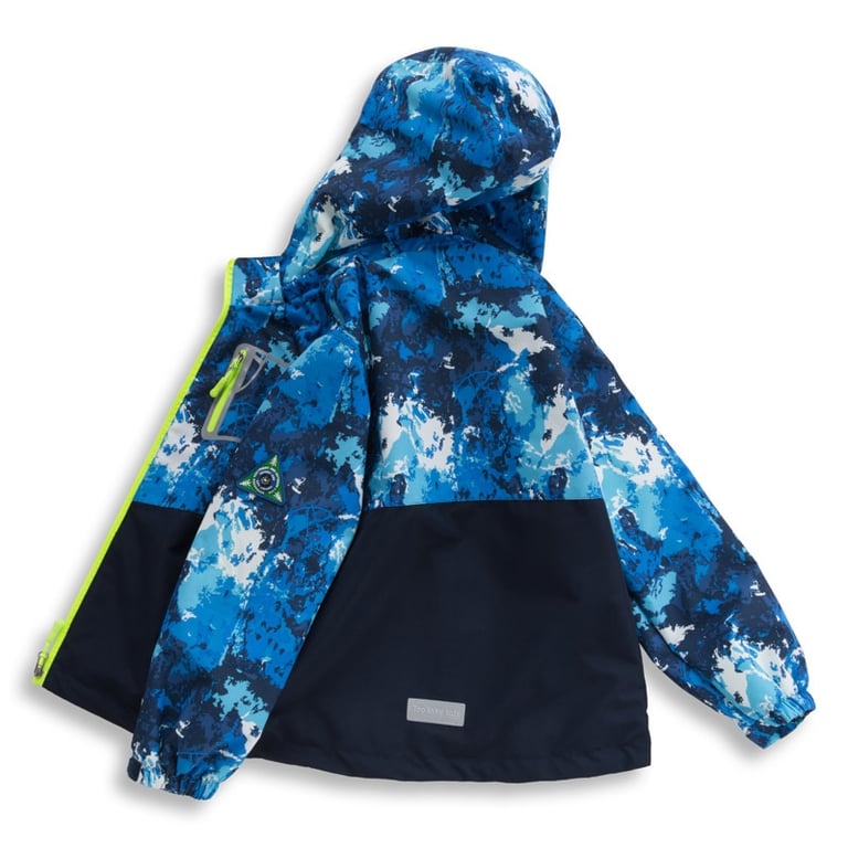 With a hood, zip fastening, higher collar to the neck, and pockets.