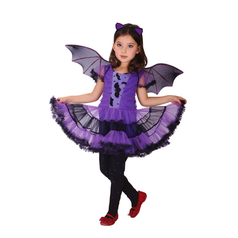 Purple bat costume for girls. The set includes a dress with a tulle ruffled skirt, wings, and a headband with bat ears.