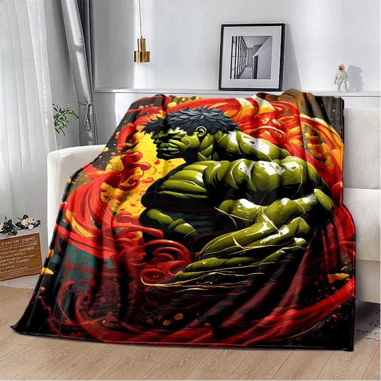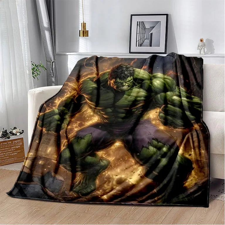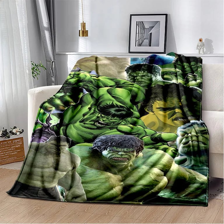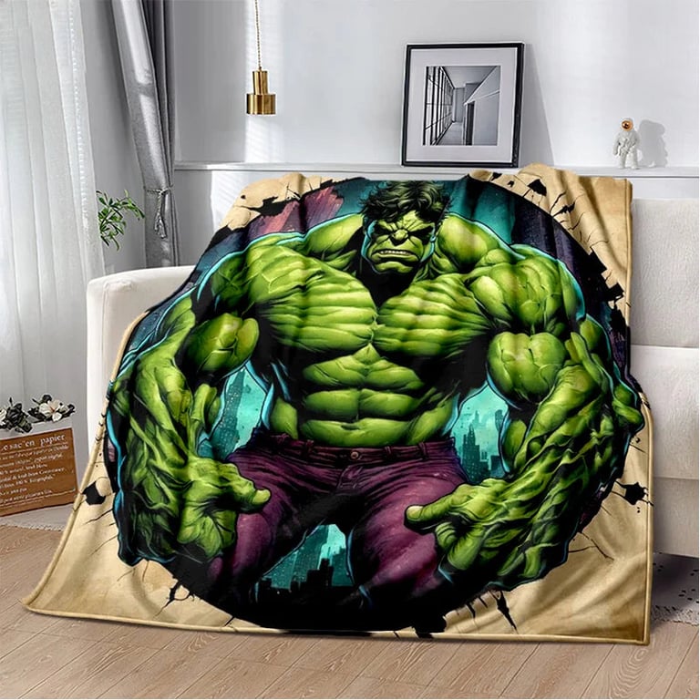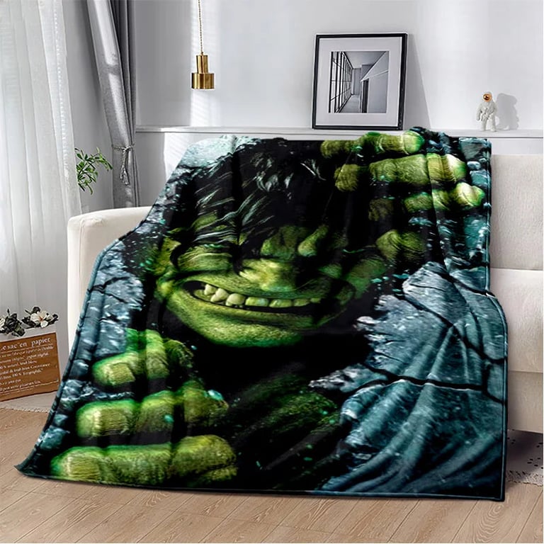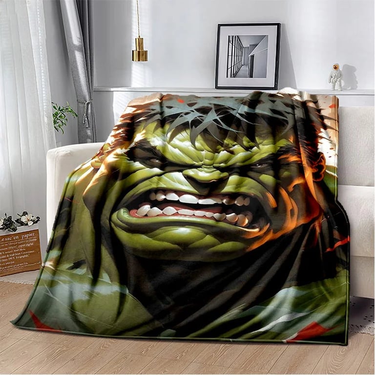 Children's blanket with 3D Hulk design.