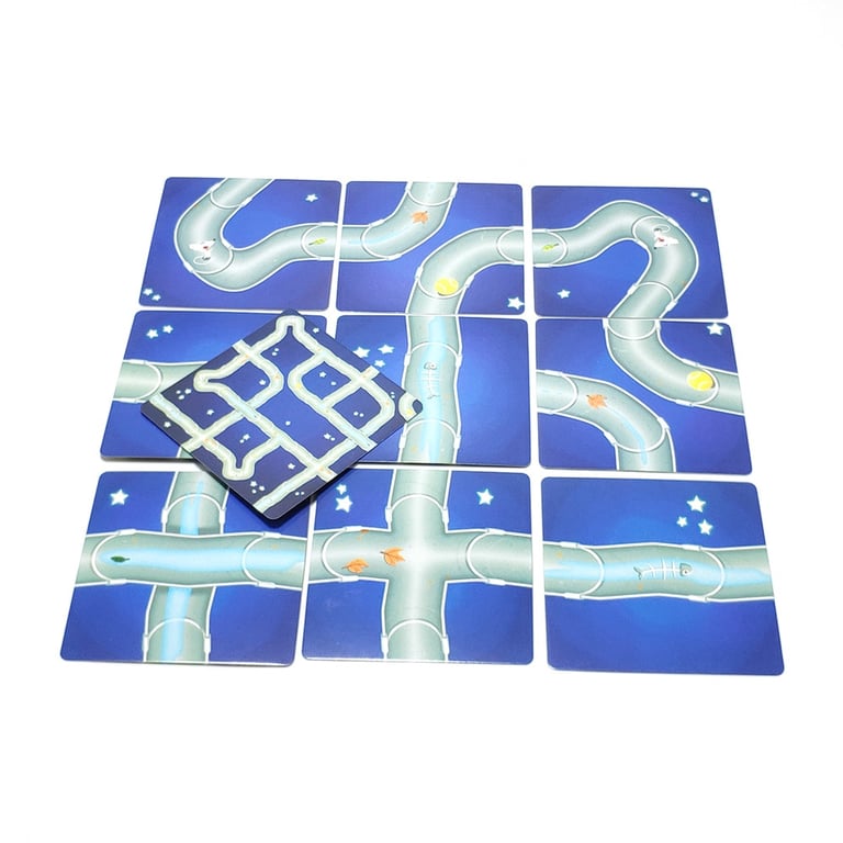 In LabirintCat, players try to help the cats reach their sweet home. The map is a 4X4 maze, the player must turn over a card and then take a card or turn a card. If after these actions the cat can reach the sweet home, the player takes a cat card. Each cat has a different value, and at the end of the game, the player with the highest score wins.