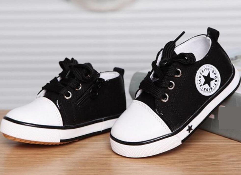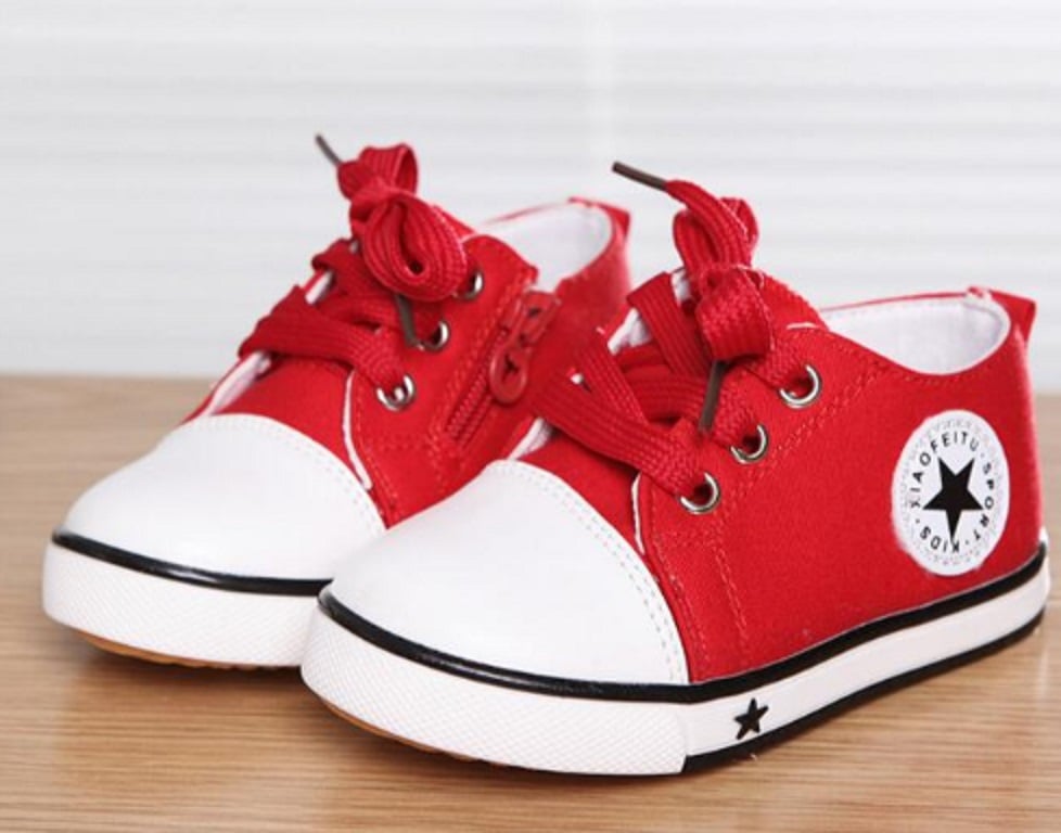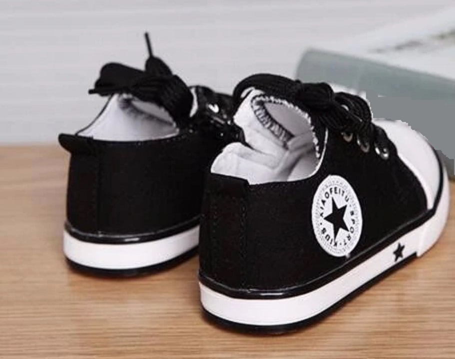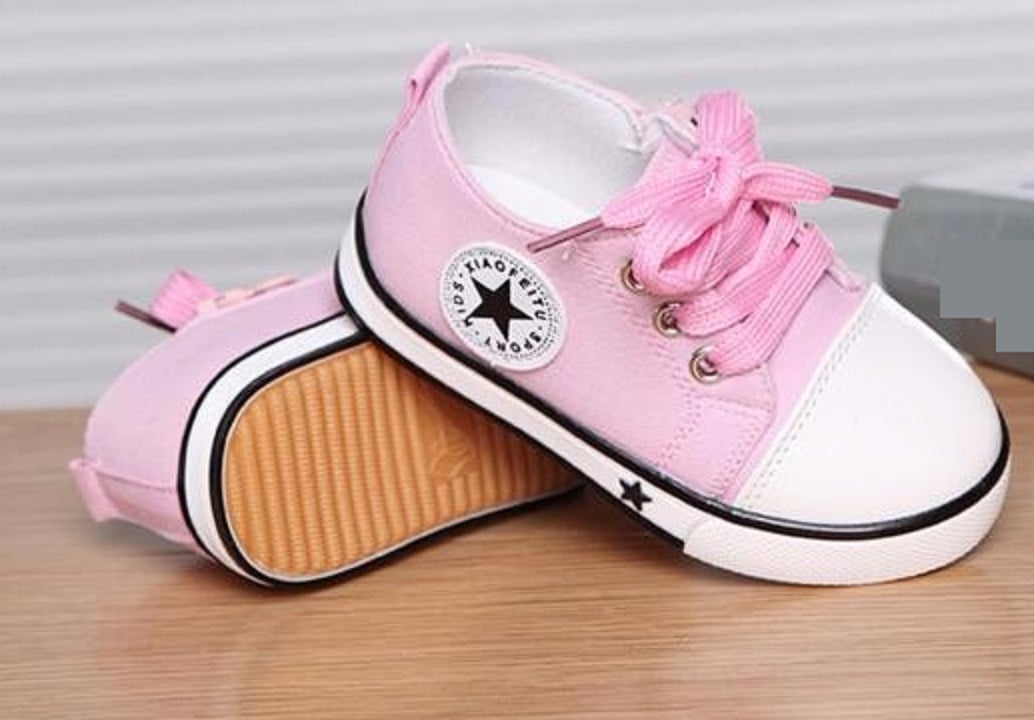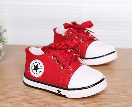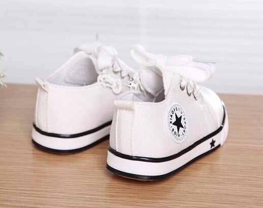 Children's canvas trainers with a star feature a rubber toe cap that protects the shoes from scuffing.