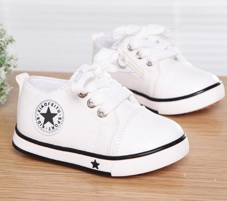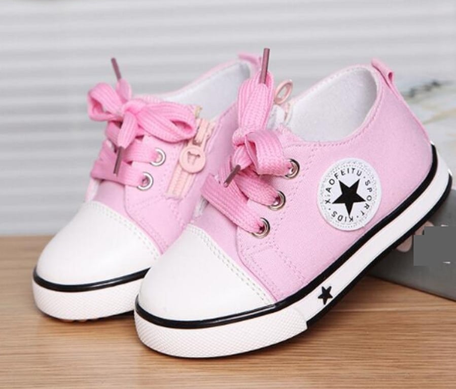 Children's canvas trainers with a star feature a rubber toe cap that protects the shoes from scuffing.