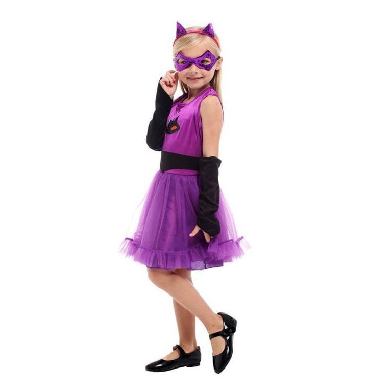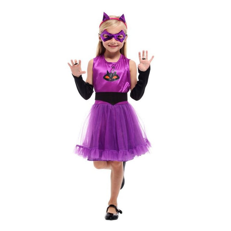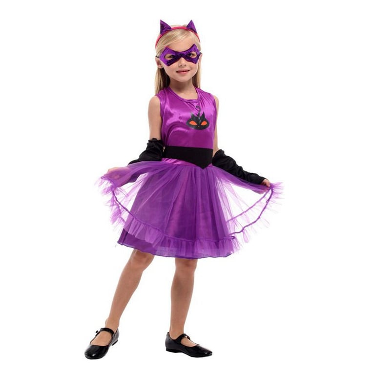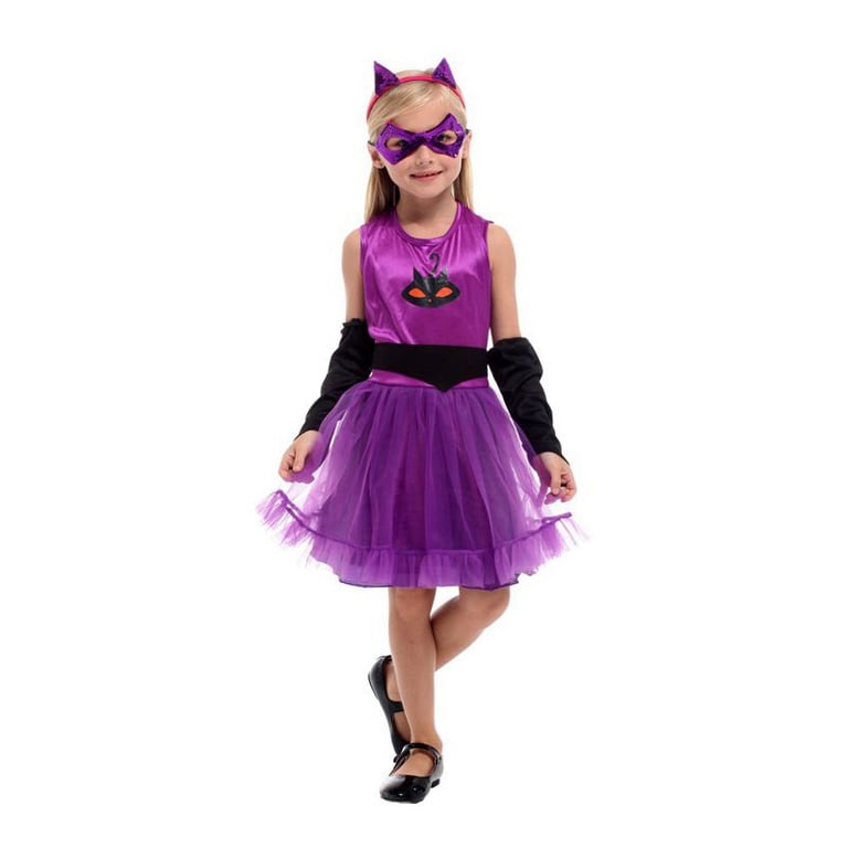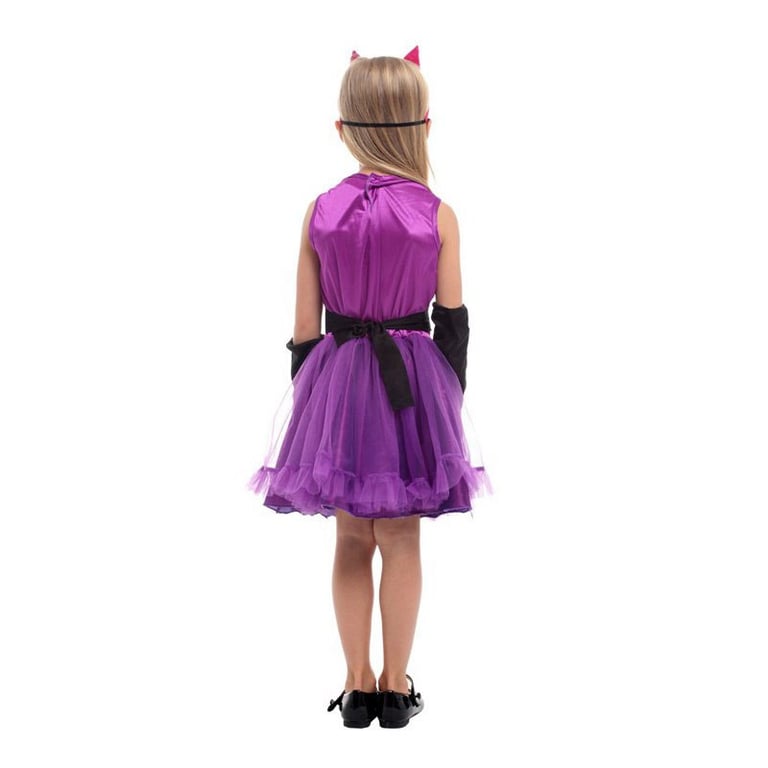 Purple cat costume for girls. The set includes a sleeveless dress with a wide tulle skirt, a headband with ears, an eye mask, a belt, and arm warmers.